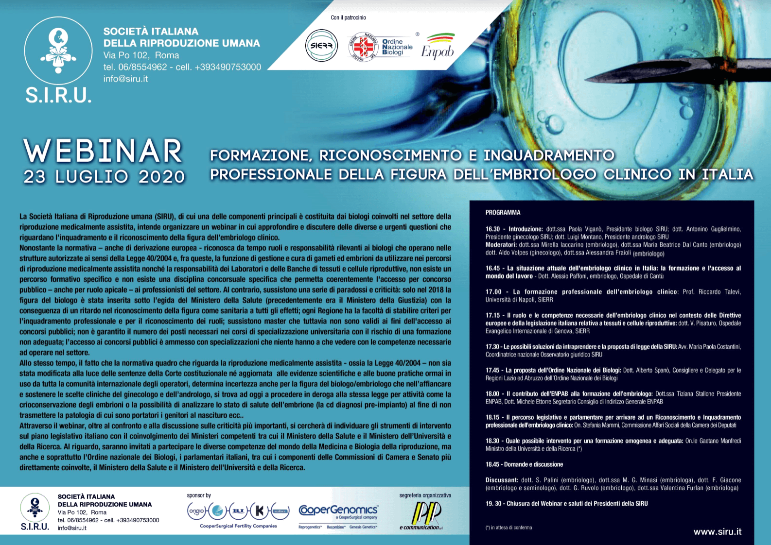 Descrizione/Info utili: La Società Italiana di Riproduzione umana (SIRU), di cui una delle componenti principali è costituita dai biologi coinvolti nel settore della riproduzione medicalmente assistita, intende organizzare un webinar in cui approfondire e discutere delle diverse e urgenti questioni che riguardano l’inquadramento e il riconoscimento della figura dell’embriologo clinico.